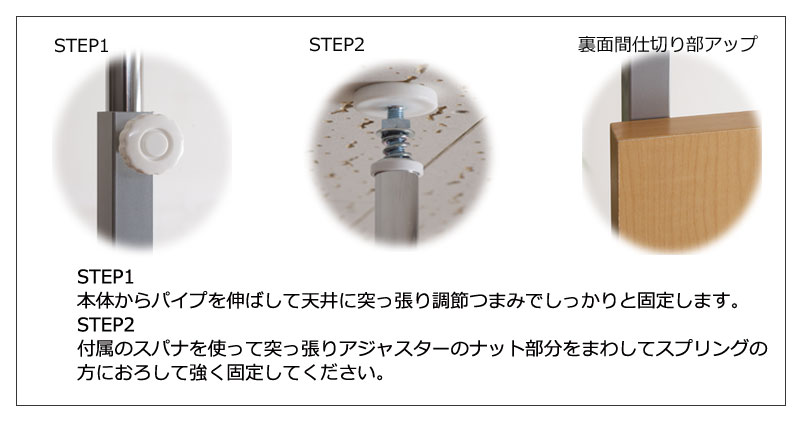 ■商品の仕様/フレーム:スチール(エポキシ粉体塗装)、パネル:プリント紙化粧繊維板■棚板/固定式:8枚 ■耐荷重量/棚:(約)5kg ■商品サイズ/本体:(約)幅60×奥行14.5×高さ202〜260cm,目隠し部高さ:(約)地面から182cm■商品重量/約22kg●日本製■組立品(組立時間:約60分) [NJ-0127/NJ-0129/NJ-0144] つっぱり パーテーション パーティション 間仕切り 突っ張り ツッパリ 壁面 天井突っ張り スクリーン 衝立 耐震 区切り スペース 仕切り 空間間仕切り 日本製 国産 国内製産品 家具 通販 インテリア